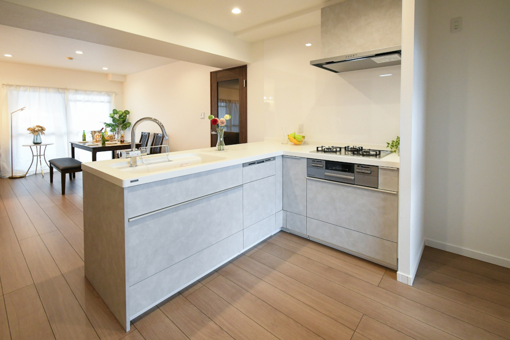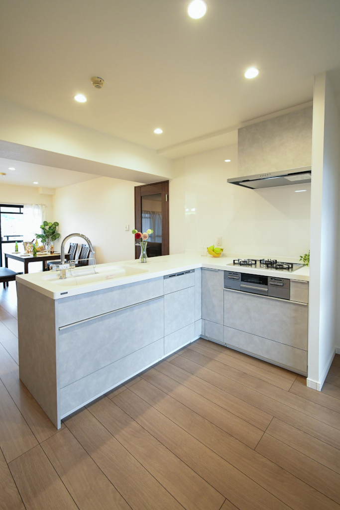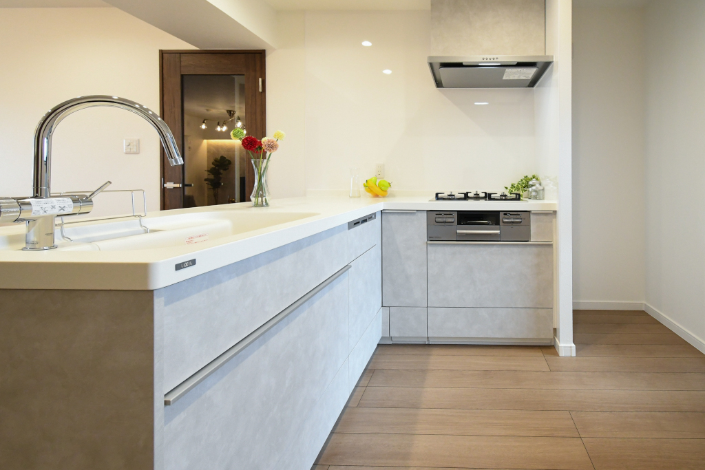 - キッチン:LIXIL リシェル L型210cm×175cm 扉ホワイトスタッコ色 人造大理石天板ソルティホワイト スキットシンクシュガーホワイト ミンタオールインワン浄水器グローエー