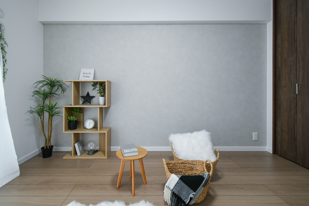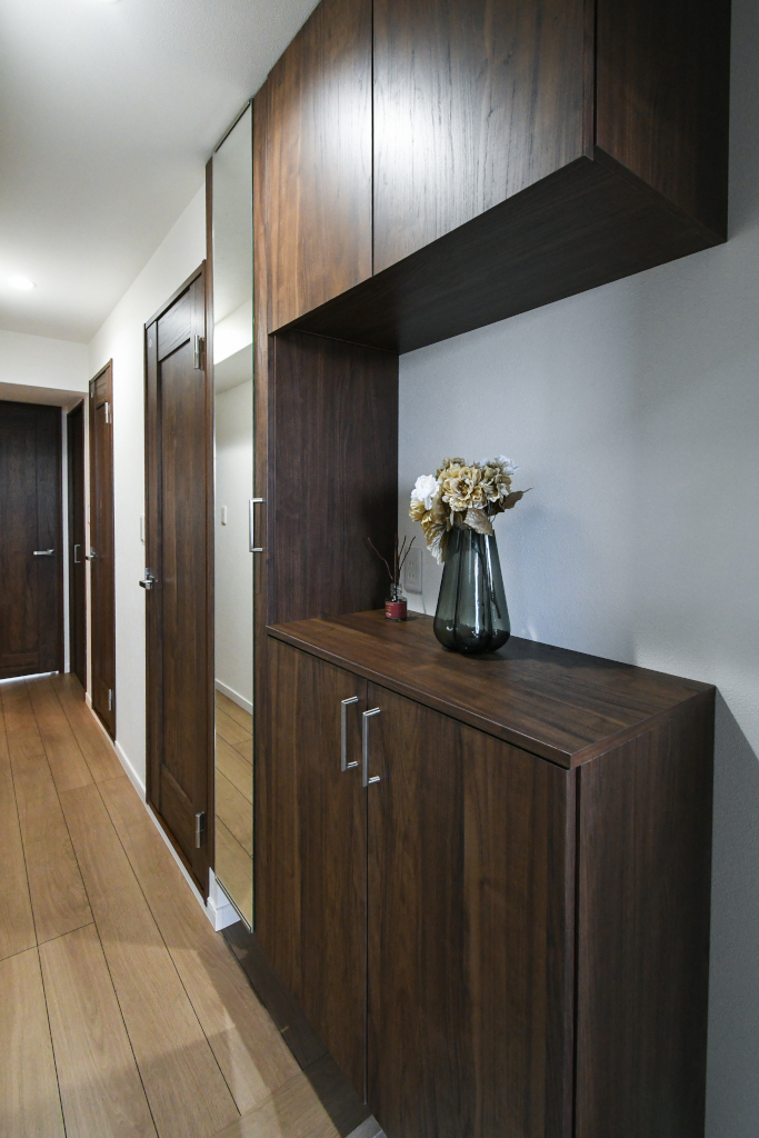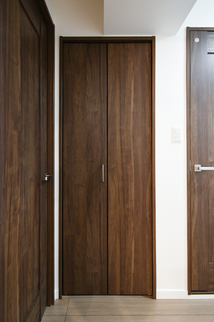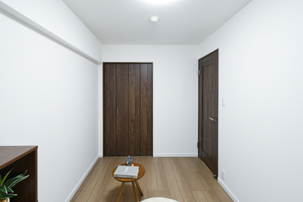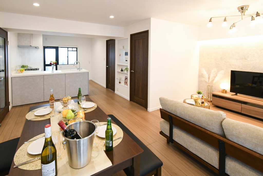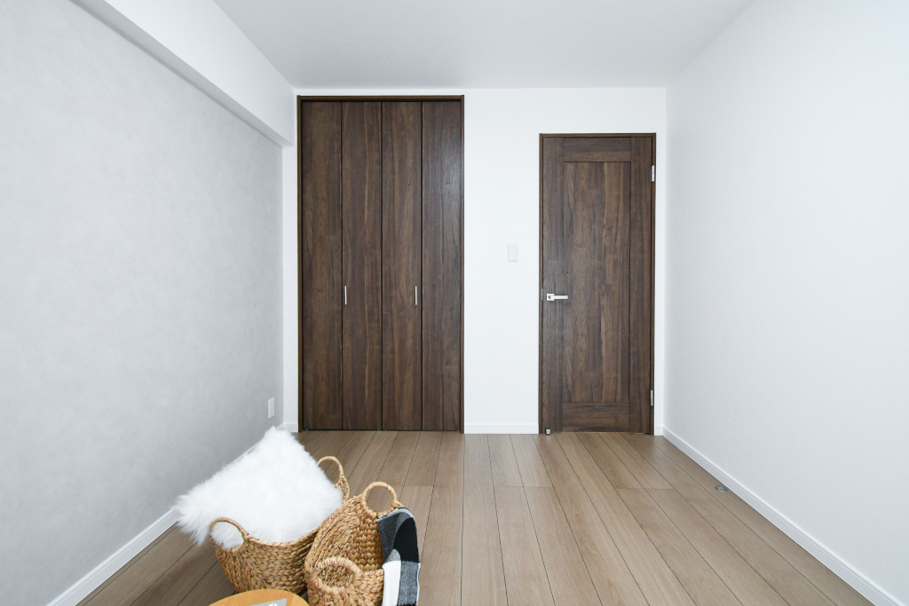2LDKにすることでリビングを広く寛ぎのある空間に出来てシックな濃い色合いとグレー組み合わせたデザイン