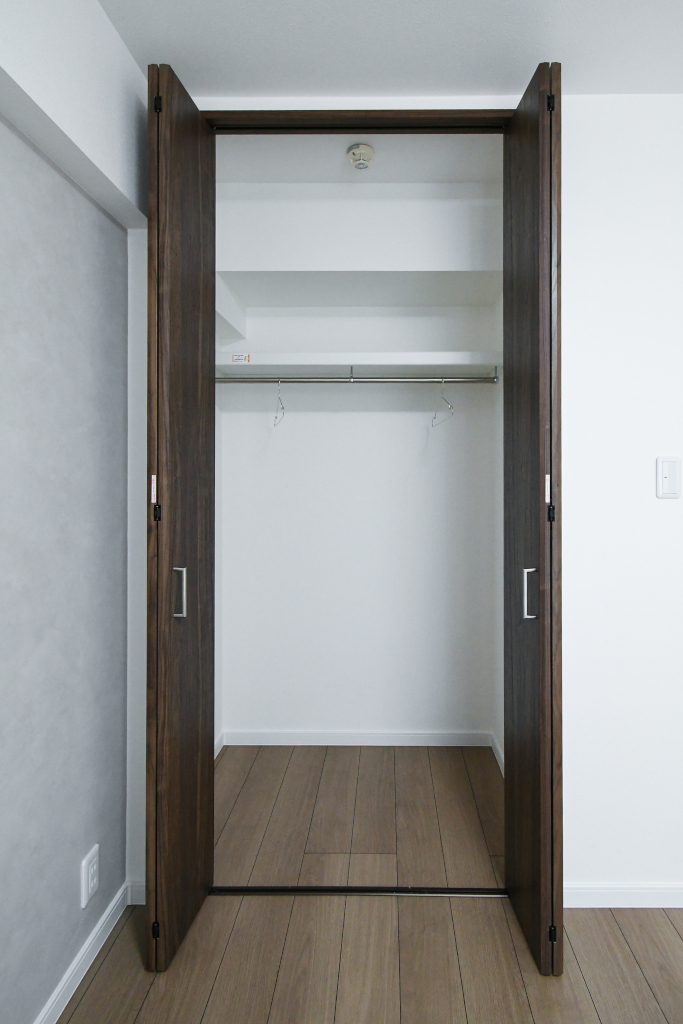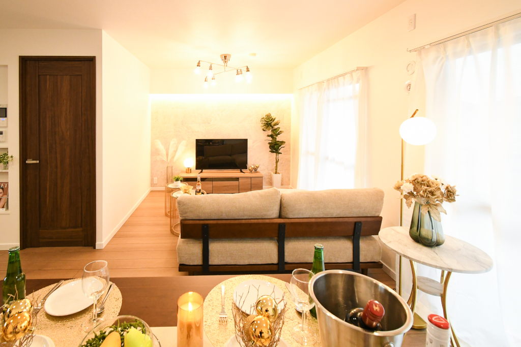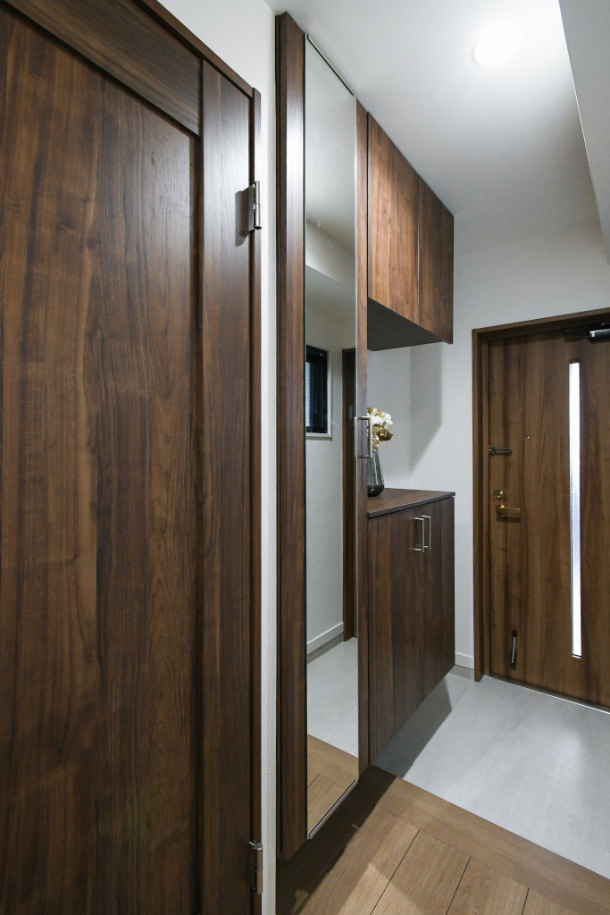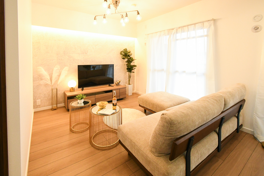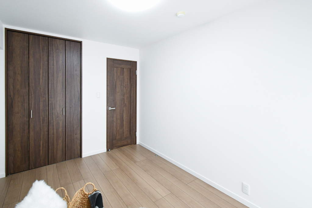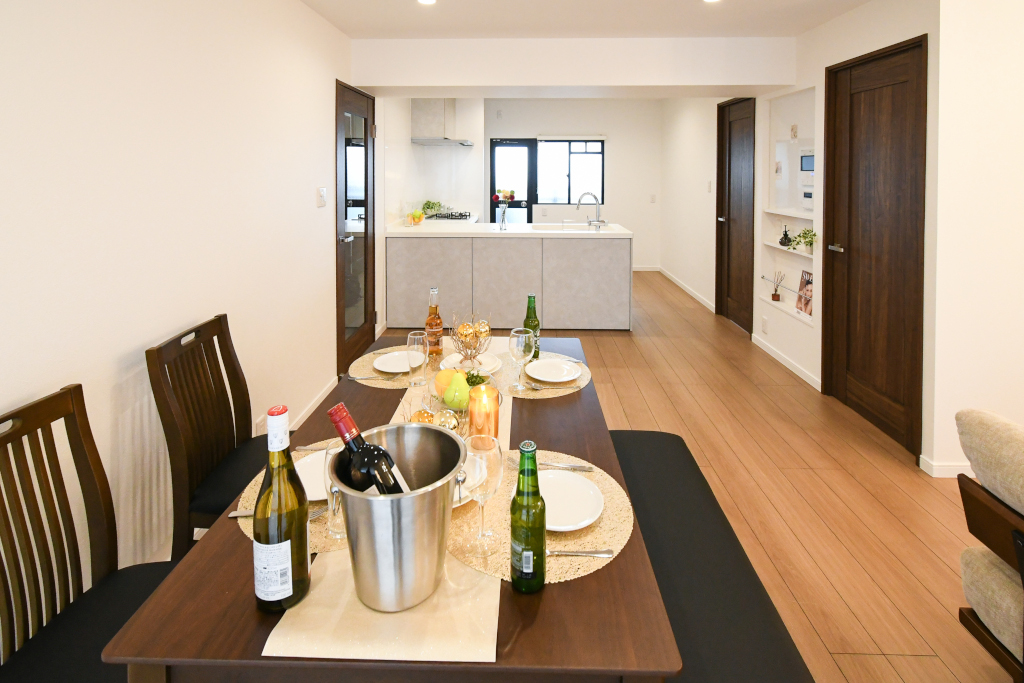 2LDKにすることでリビングを広く寛ぎのある空間に出来てシックな濃い色合いとグレー組み合わせたデザイン
