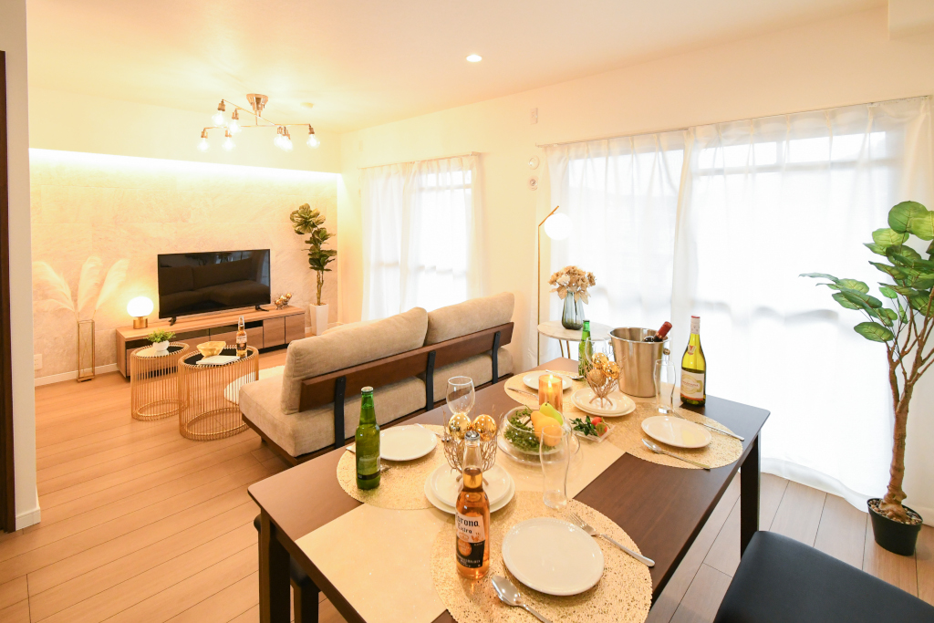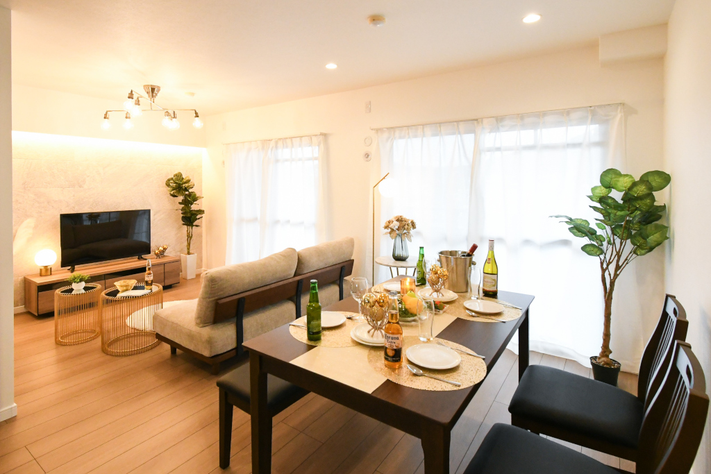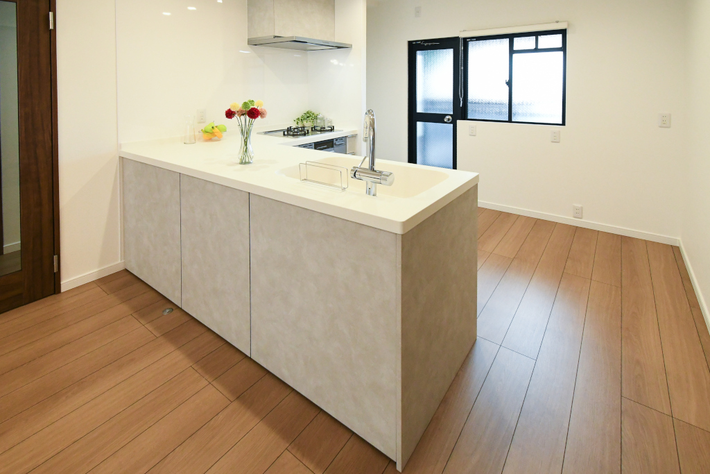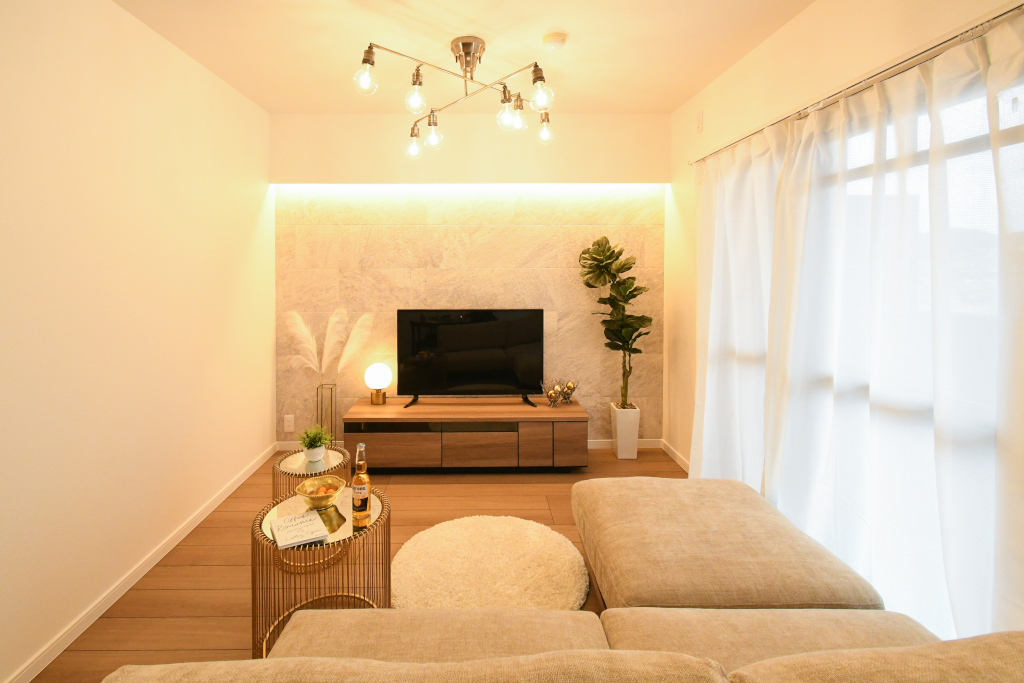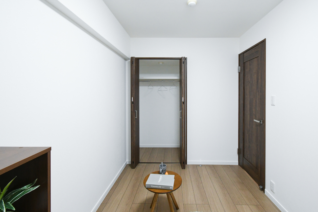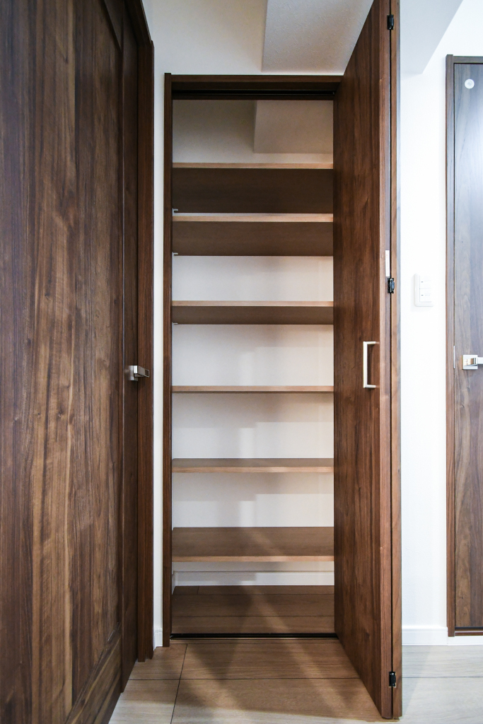 2LDKにすることでリビングを広く寛ぎのある空間に出来てシックな濃い色合いとグレー組み合わせたデザイン